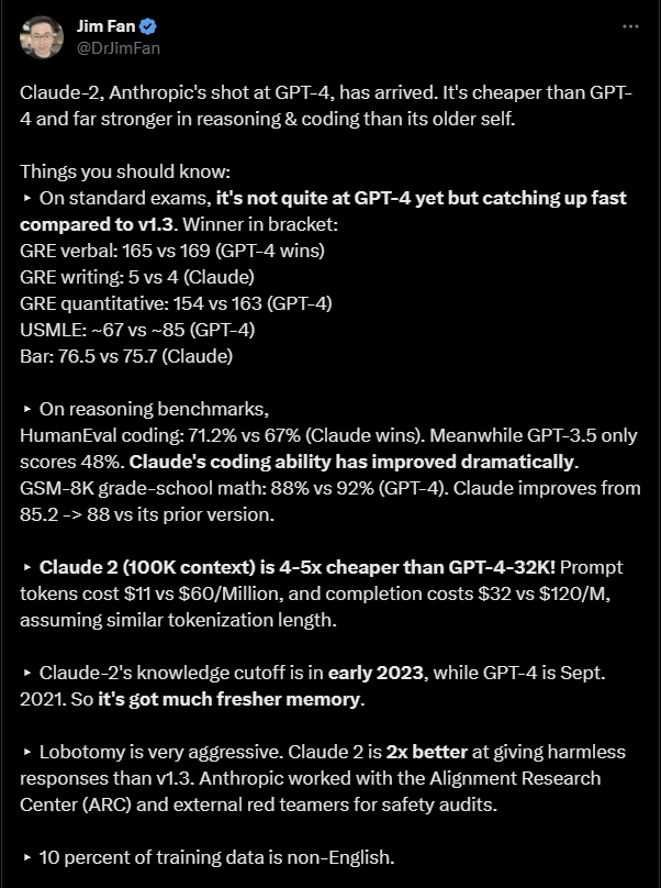For a high level summary of what Claude offers, check out this tweet from Jim Fan: